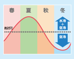 - 空冷式凝縮器で足りない放熱分を水冷凝縮器が補います。