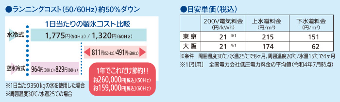 - ランニングコストは水冷式と比較して、消費水量の大幅低減により、年間260,000円[税別](50Hz)も節約できます。(SIM-AC480YW-FUB4との比較)