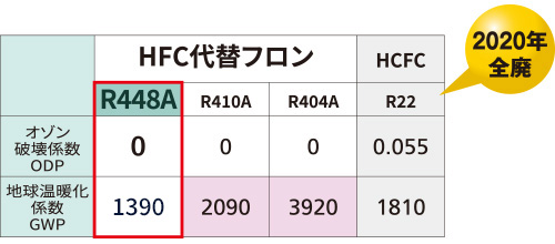 R448Aは、フロン排出抑制法で求められるメーカー出荷規制の基準値(2025年までに出荷台数による加重平均をGWP1500以下にすること)をクリアした冷媒です。